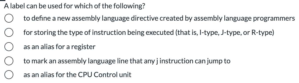 PDF Assembly Language Programming - UTEP - Labels are symbols - Labels must begin in column 1. - A label can optionally be followed by a colon - The value of a label is the current value of the Location Counter (address within program) - A label on a line by itself is a valid statement - Labels used locally within a file must be unique. Adapted from notes from BYU ECE124 5 Jumping to Labels in Inline Assembly | Microsoft Docs Labels defined in __asm blocks are not case sensitive; both goto statements and assembly instructions can refer to those labels without regard to case. C and C++ labels are case sensitive only when used by goto statements. Assembly instructions can jump to a C or C++ label without regard to case. The following code shows all the permutations: LC3 Assembly Language.ipynb - Bryn Mawr College LC3 Assembly Language¶. More abstract, with additional powers: Labels; Instruction and Register names; Assembler Directives.ORIG - location to store code/data.END - end assembly process.FILL - Value for this memory location.BLKW - Block of Words.STRINGZ - Initialize memory with ASCII values, 0-terminated; Shorthand for using decimal and hexadecimal numbers What are Labels in assembly language? - Quora The label is in fact a shorthand for skipping the manual calculation of the number of bytes to add to or subtract from the index pointer, for jump to label means just setting the new place in the memory the execution should continue at, ip+ or - some value.