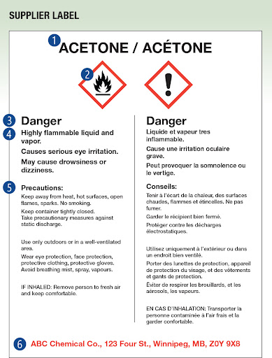 WHMIS 2015 Labels | Supplier Labels | WHMIS Workplace Labels WHMIS 2015 supplier labels must contain the following elements: Product identifier- name of hazardous product, as reflected on (M)SDS [can be a chemical name, common or brand name, generic name or trade name] Pictogram(s)- applicable hazard symbols within red diamond. The Complete Guide to GHS Labels and Compliance Requirements Here are the label design specifics that must be followed, according to OSHA: All information must be entirely legible; All printed information must be written in English; All printed information can include other languages in addition to English, if necessary; The label must be large and prominently displayed on the outside of the container How many labels are required on a supplier label? Also Know, what are the 6 pieces of information required on a supplier label? WHMIS supplier label requirements. Product Identifier: this is may be the chemical name of a product, its trade name, common name or code. Supplier Identification: the name of the company that made, distributed or sold the product. Hazard Symbol(s): one or more of the symbols that indicate the classification of the product. Does a supplier label have to have a pictogram? WHMIS 2015: The Supplier Label - WorkSafeBC • statementsMost supplier labels show six types of information. • règlements locaux en vigueurThe written information must be shown in both English and French. Supplier labels may be bilingual (as one label) or available as two labels (one in English, and one in French). • The pictogram(s), signal word, and hazard statement(s) must be grouped together.